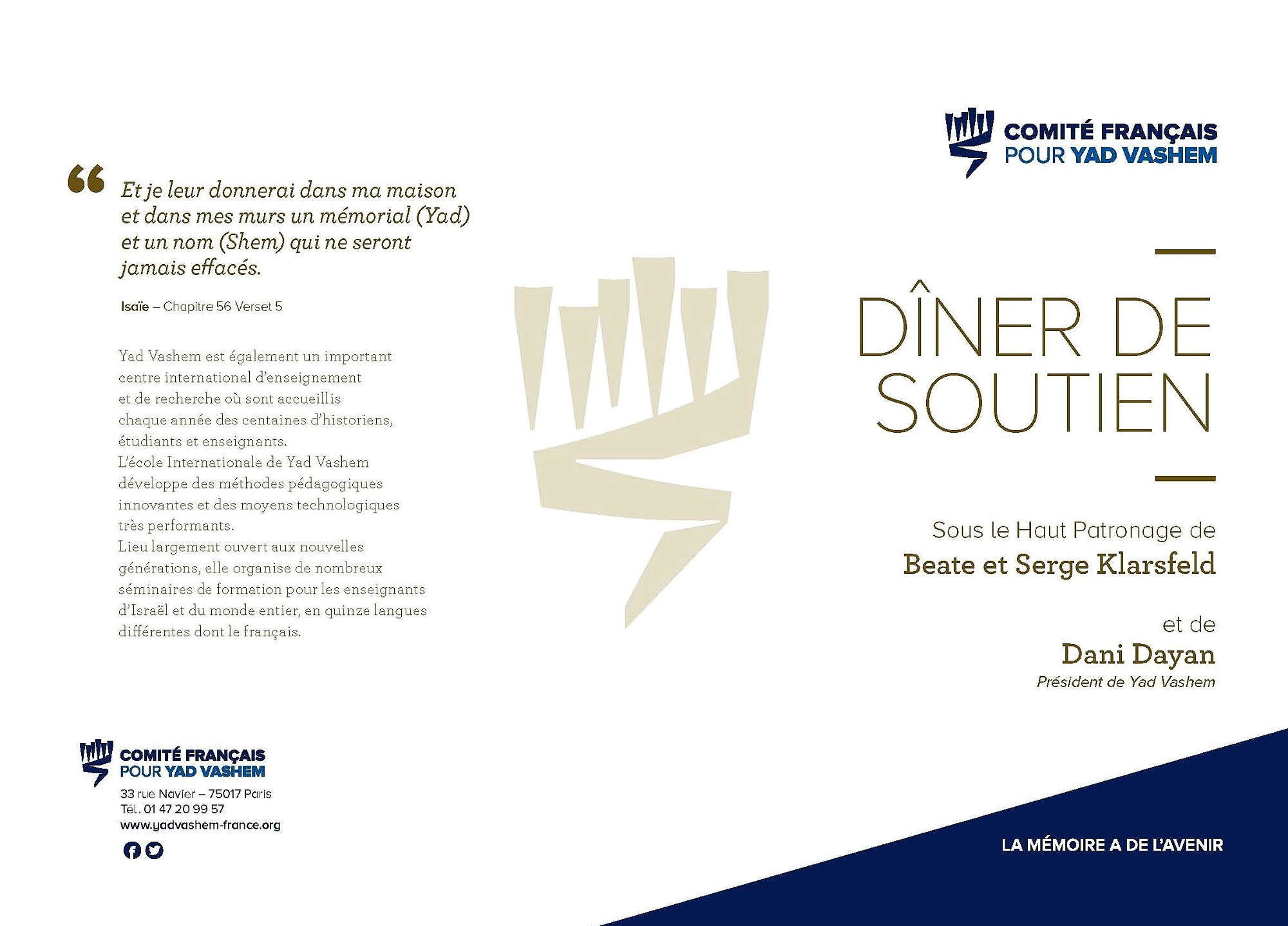 David Adam2021-12-03T09:51:03+01:00 NOUS AVONS BESOIN DE VOUS La forte résurgence de l’épidémie de Covid 19 nous a conduit ce matin à décider l’annulation de notre Dîner de Soutien annuel prévu mardi 7 décembre à l’hôtel InterContinental Paris le Grand. En effet, nous considérons qu’il ne serait pas responsable de notre part de faire prendre un risque sanitaire aux plus fragiles d’entre nous. Cette décision nous affecte profondément car tout était prêt pour une nouvelle grande et belle soirée célébrant la mémoire des Justes parmi les Nations. Elle [...]