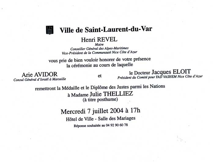 Invitation cérémonie Thelliez – Comité Français pour Yad Vashem