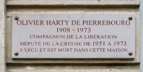 sur la façade de l’immeuble du 14 rue de Tournon à Paris (VIe) où Harty De Pierrebourg Olivier vécut.